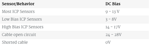 The signal output of an ICP sensor is a low impedance voltage signal proportional to the dynamic measurement such as force, pressure, or vibration. This voltage signal is carried on a DC bias voltage. The AC dynamic signal is superimposed on the DC bias voltage and is allowed to swing between the supply voltage and ground. Unlike an Operational Amplifier (Op Amp) that requires a plus and minus supply and allows the signal to “ride” on ground and “swing” between the plus and minus “rails,” the ICP sensor requires the output signal to be DC biased.